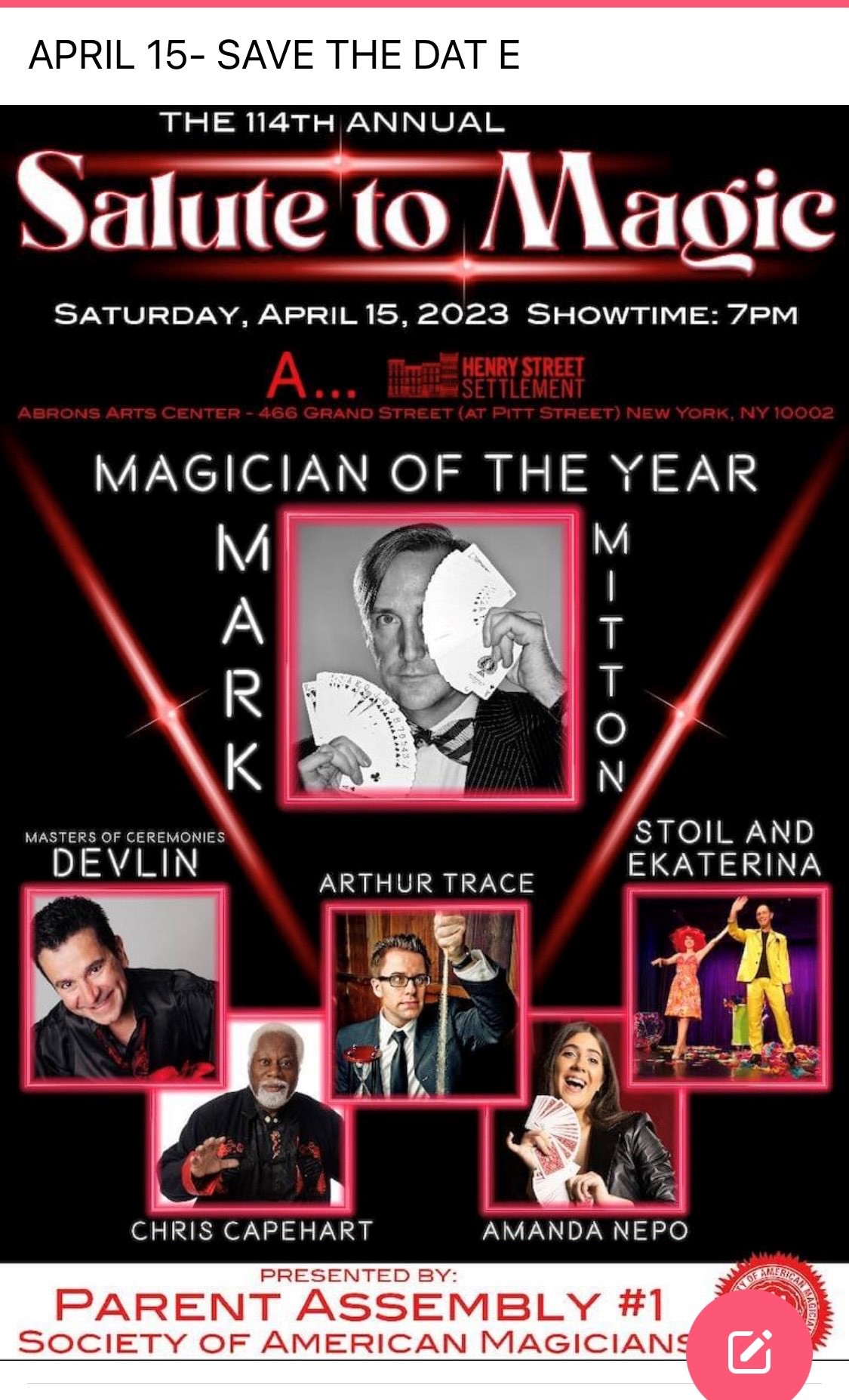 The Salute to Magic, produced by Parent Assembly #1 of the Society of American Magicians, is the oldest continuing Magic Show in the country. The featured acts range from Arthur Trace, an award-winner at FISM, the prestigious World Championships of Magic, to Amanda Nepo an 18 year-old conjuror and magic inventor performing the original act with which she fooled Penn & Teller on their TV show. The show will be held in the historic Playhouse Theatre at the Abrons Arts Center, 466 Grand Street, on the Lower East Side of Manhattan. Go to SaluteToMagic.com for your tickets!