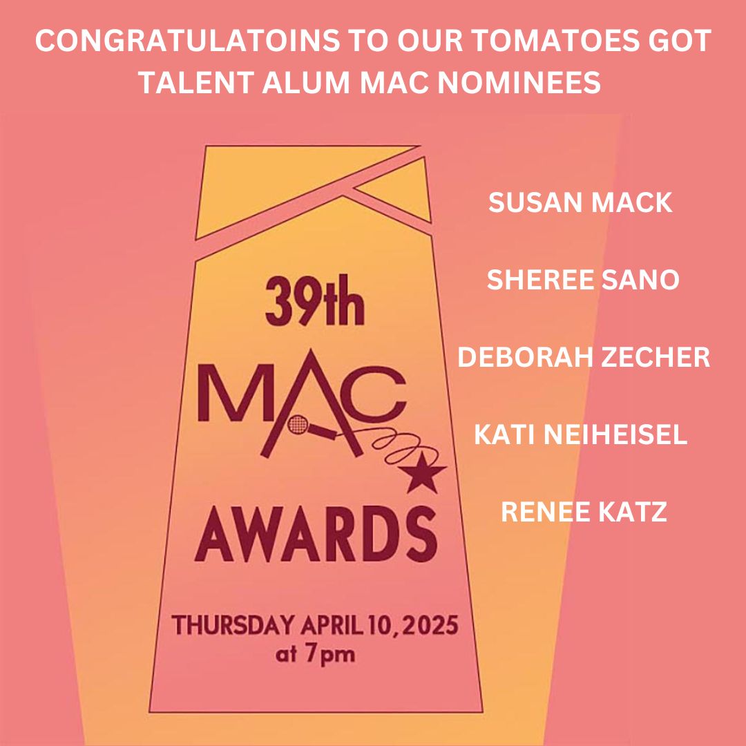 Randie Levine Miller and I are absolutely thrilled with this news. Five of our Tomatoes Got Talent alums have been nominated for MAC Awards 2025 which will honor excellence in NYC nightlife during the 2024 calendar year. They are: SUSAN MACK, SHEREE SANO, DEBORAH ZECHER, KATI NEIHEISEL and RENEE KATZ. They are all winners, and we can’t wait to see who takes home a MAC award. The awards presentation and show will take place on Thursday, April 10, 2025 at 7:00 PM, at Peter Norton Symphony Spac.