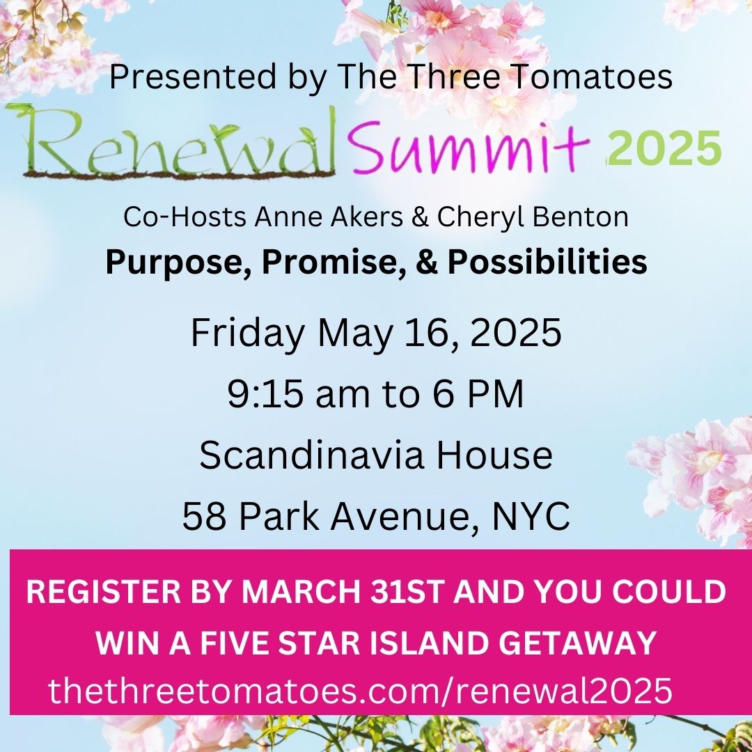Our Renewal Summit is gearing up with an incredible lineup of speakers and stimulating topics including AI, your health from head to toe, living abroad, our Woman of Purpose award, music, and a couple of surprises. Fabulous exhibitors with products and services you will love are also getting ready to join us for another amazing day. Don’t miss out on this exceptional event! GET THE DETAILS.