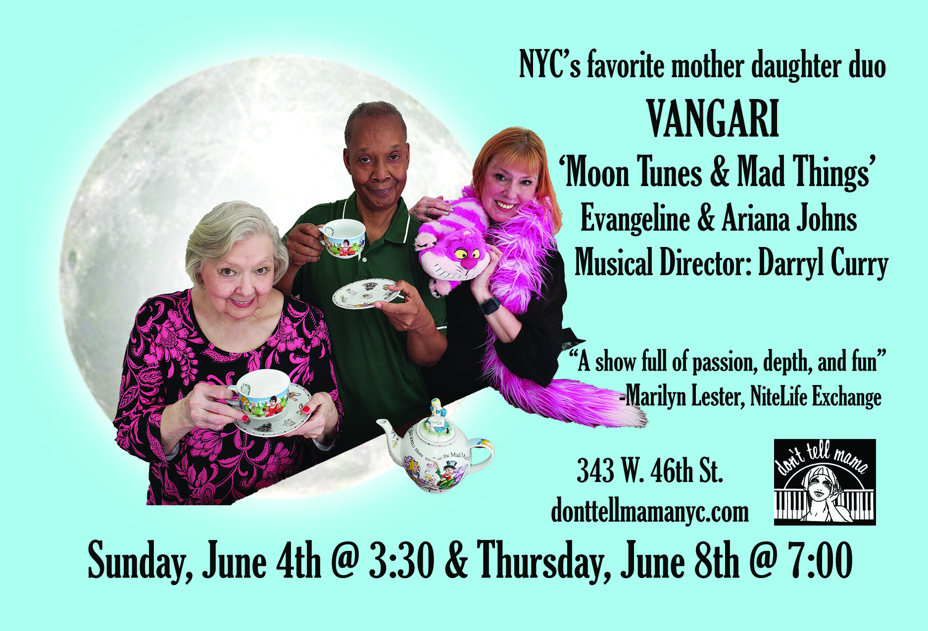 VANGARI: NYC’s favorite mother/daughter duo, Evangeline and Ariana Johns, with Darryl Curry on piano, will perform their new show, ‘MOON TUNES & MAD THINGS’! at Don’t Tell Mama. Get your tickets.