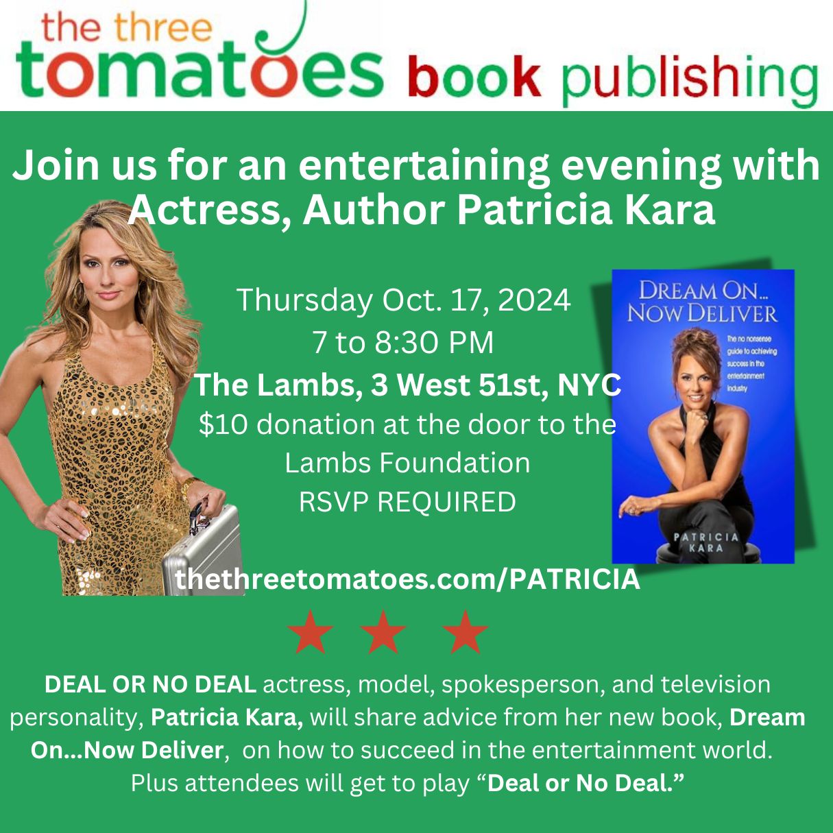 Join us on October 17 at the historical The Lambs (the oldest theatrical society in the country) to meet actress/author Patricia Kara. Famous for her role on every season of Deal or No Deal with Howie Mandell, Patricia will share insights from her book. The evening will also feature a chance to play Deal or No Deal with her and you could win a fabulous 5-star Resort Vacation. Wine & snacks too. RSVP is a MUST.