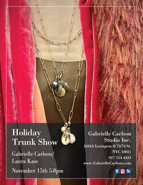 Fashion designer Gabrielle Carlson will host a holiday trunk show for jewelry designer Laura Kass. And PS, they are both exhibitors at our December 5th Holiday Event too! Gabrielle Carlson Studio, 1034A Lexington Avenue @73/74th Street.