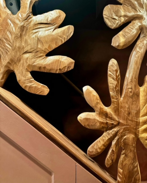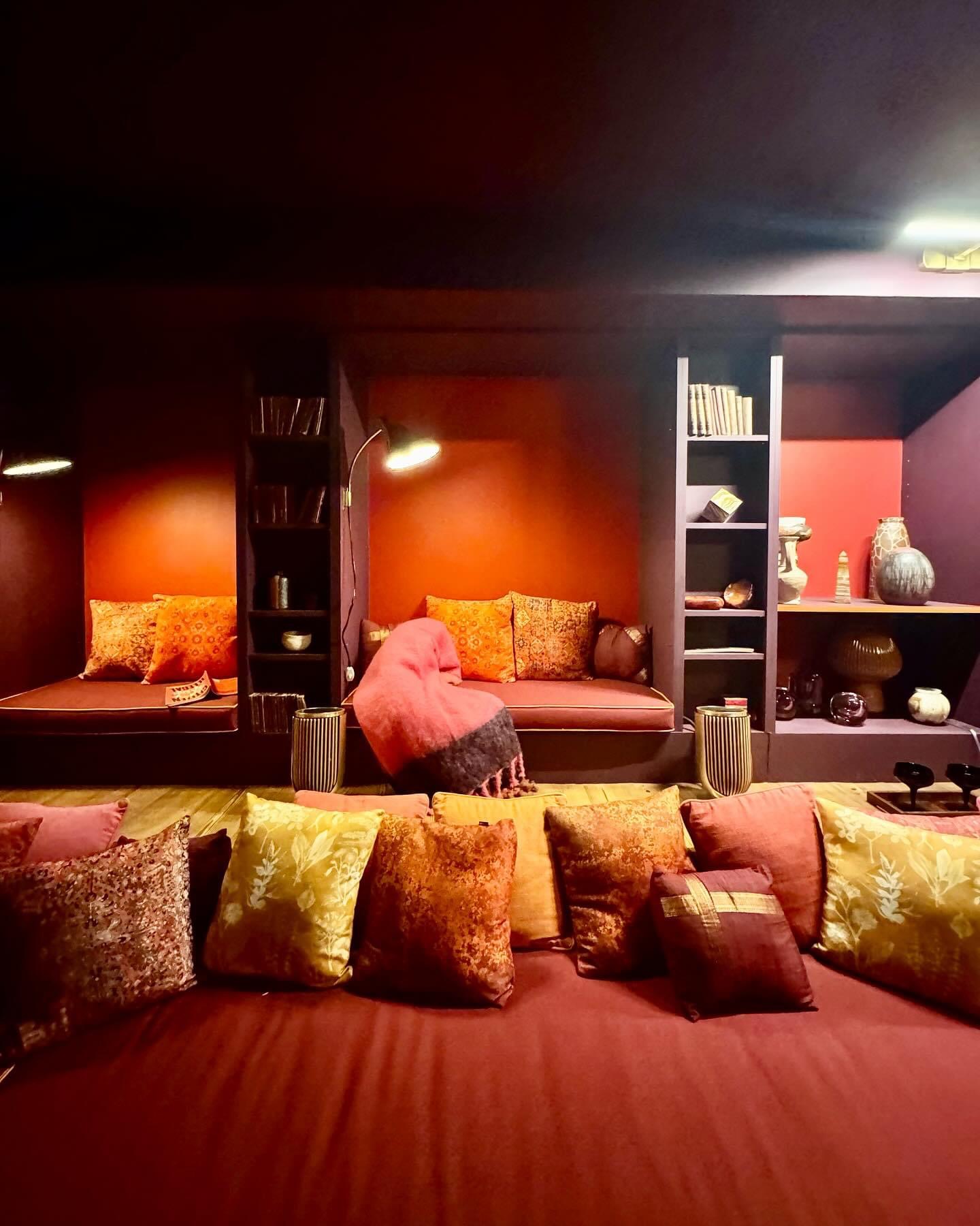 Some of the most remarkable decorations are the transformation of the cellar by Batliboi Studio, who took a mostly unusable space with 6 foot ceilings, dropped the floor and created a cozy media room with a very groovy opium den vibe. Standing in this plush, plum, pillowed space I felt like I Dream of Genie inside her bottle. The deep toned palette of this room was actually inspired by the colors of the Brooklyn Kings Theater.