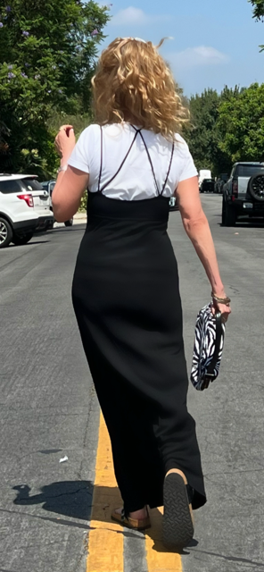 The back strappy detailing on my long matte jersey dress, Anni Kuan, gets some extra looks layered over a bright white crewneck t-shirt, Haynes. The white under the black makes the entire dress pop! My look still feels like Summer but the layering gives it more of a transitional vibe.