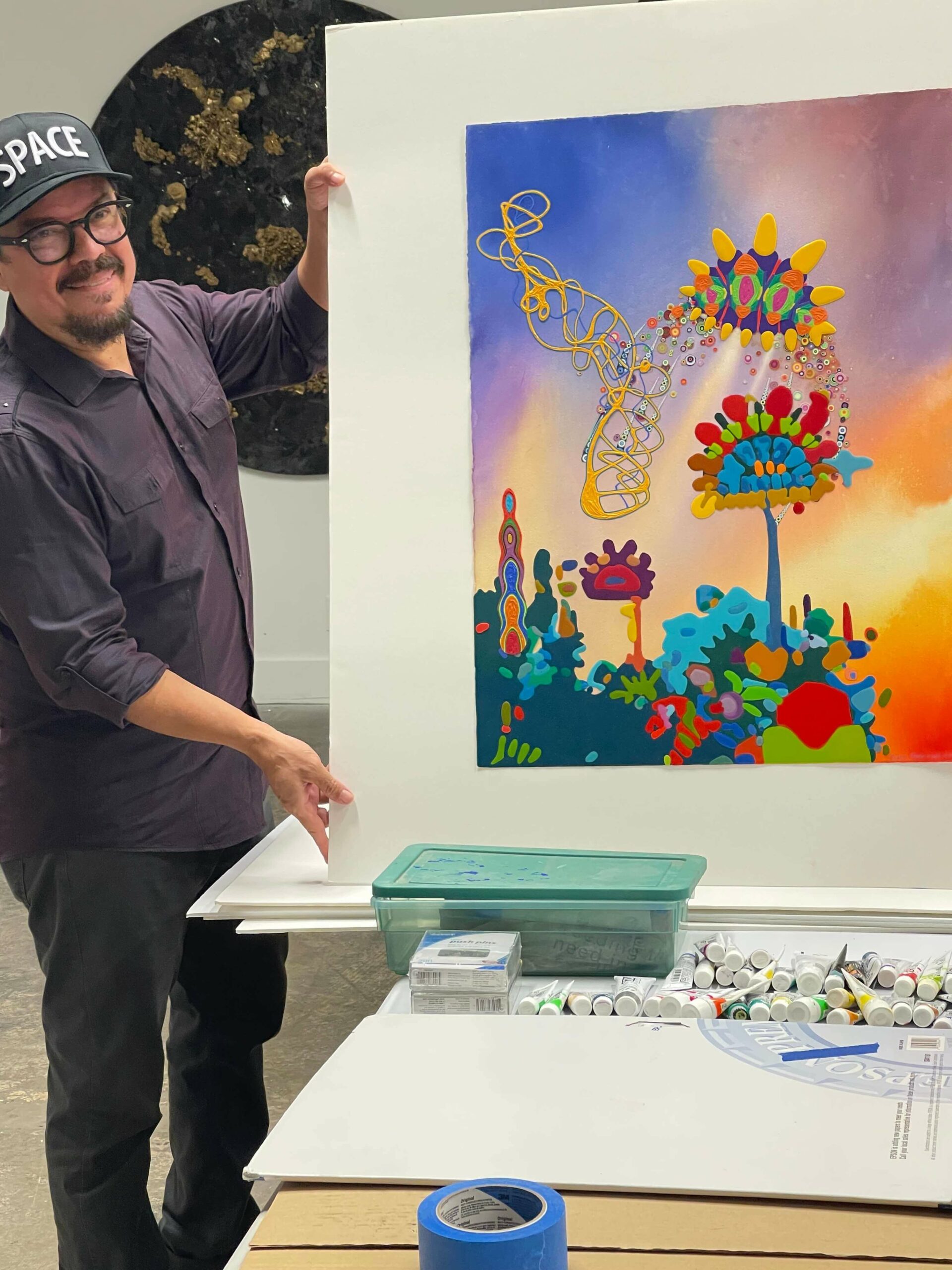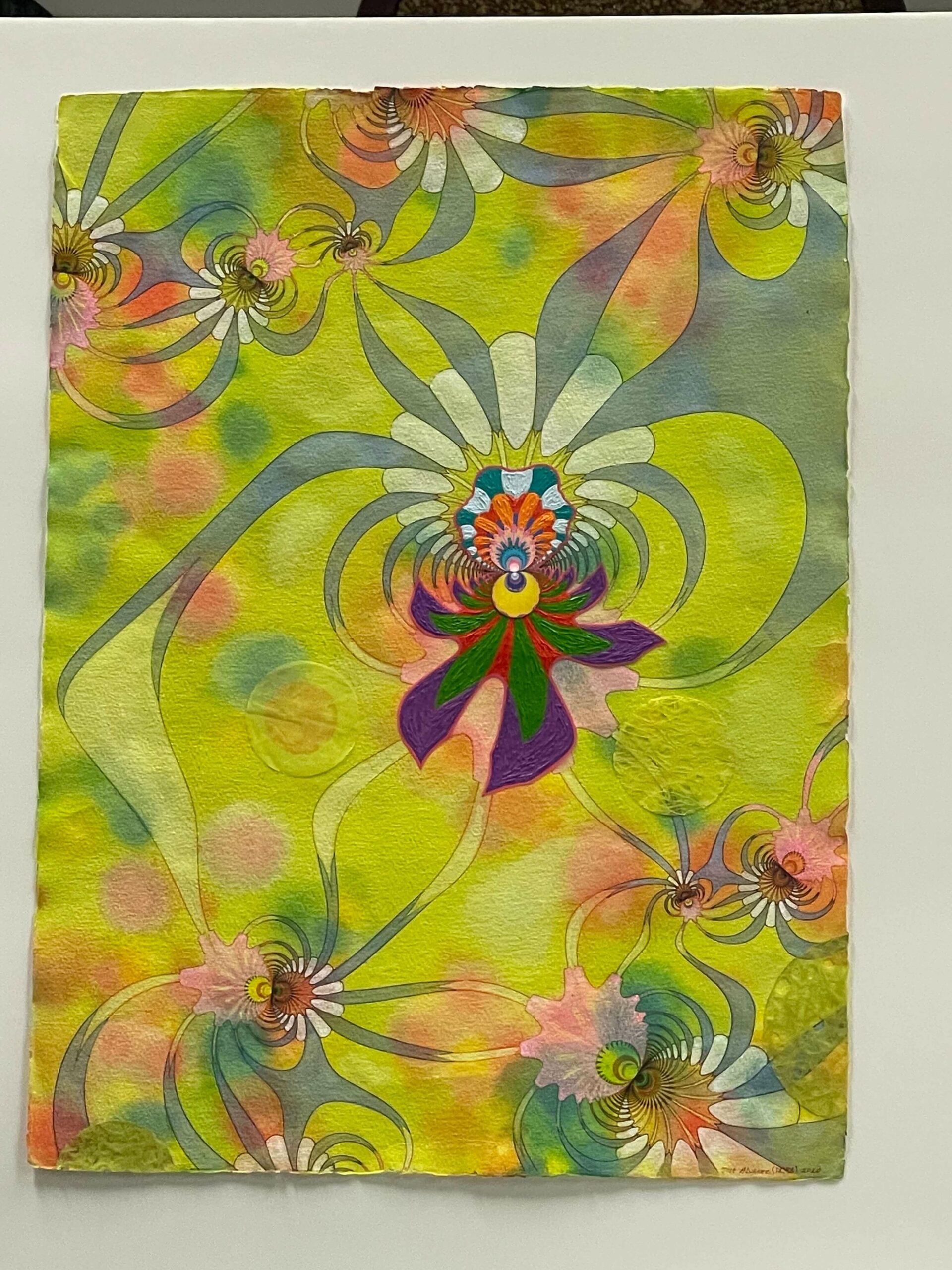 Preferring to share his art in a more intimate form, he now creates paintings, collages on mica, videos and installations where he reflects on social justice, the plight of the Venezuelan Exile, and interacting components of science, spirituality and mysticism. His work bursts with color, psychedelic patterns, lush floral imagery and traditional shamanic materials such as crystals and porcupine quills.