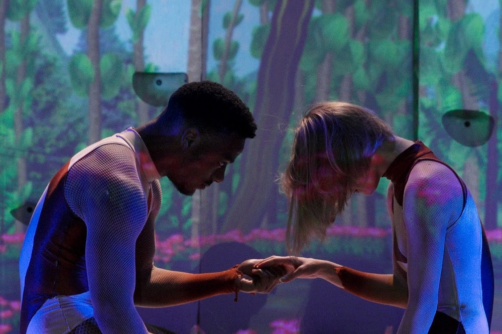 The piece runs 65 minutes in length and is adapted and handsomely directed by NMA’s co-artistic director & longtime company member Jones (Welsh) Talmadge. It is performed without dialogue, but combines dance, movement, music, aerial acrobatics, and interactive video projections, to create a theatrical world that never stops moving. The visual design by J-Walt Adamczyk (who also plays Father God) is dazzling, with psychedelic images that morph and mature like a living breathing character, all generated by cast members on stage.
