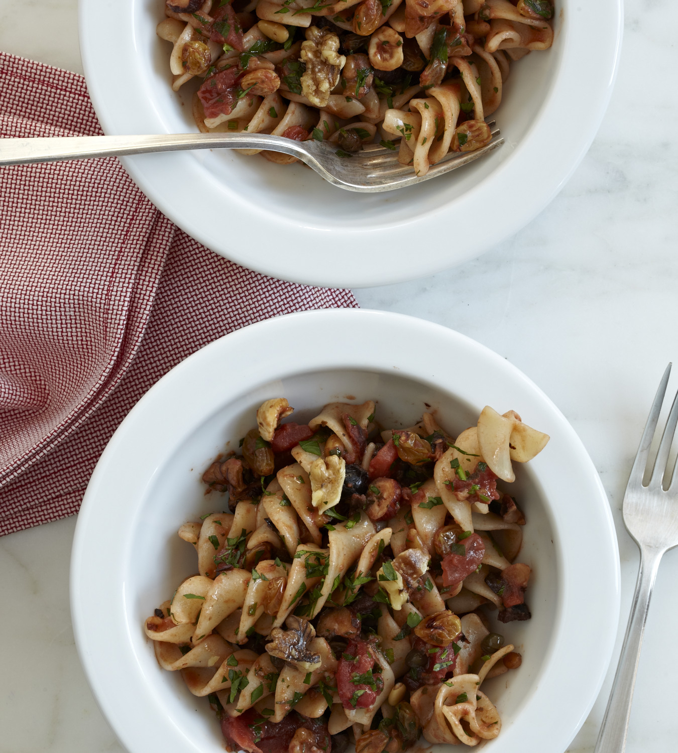 I love this recipe because it’s exceptionally flavorful, yet totally vegan and simple to make. A handful of nuts, a few raisins for sweetness, capers and black olives for tang, with a hint of garlic and tomatoes—a feast in 5 minutes.