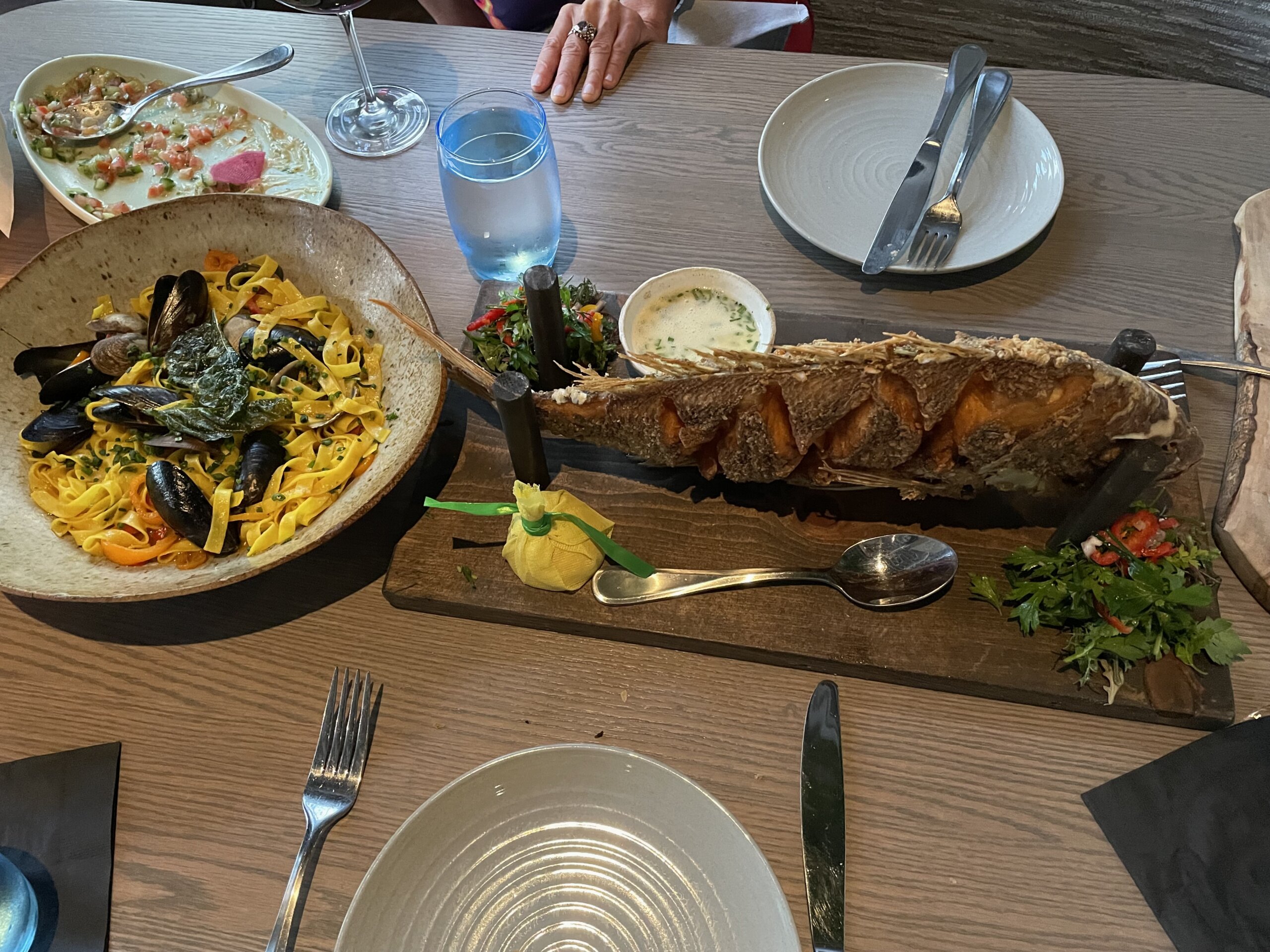 But when it does, my pescatarian Foodie Friend and I couldn’t be happier. The de rigeur oysters to start were accompanied by a mignonette that far surpassed the usual watery vinegar and shallot concoction. The kingfish ceviche was enlivened by the oregano oil infusion and the house specialty of dry-aging the fish. Curing and smoking I know, but this is a process new to me in the world of seafood cookery, and it really brings forward the best of the fish’s essence. A whole fried cod, presented imaginatively with a simple lemon caper dipping sauce was a standout as was the saffron-scented spaghetti with clams that upped its flavor quotient with a briny uni nage. Yum, yum and more yum.
