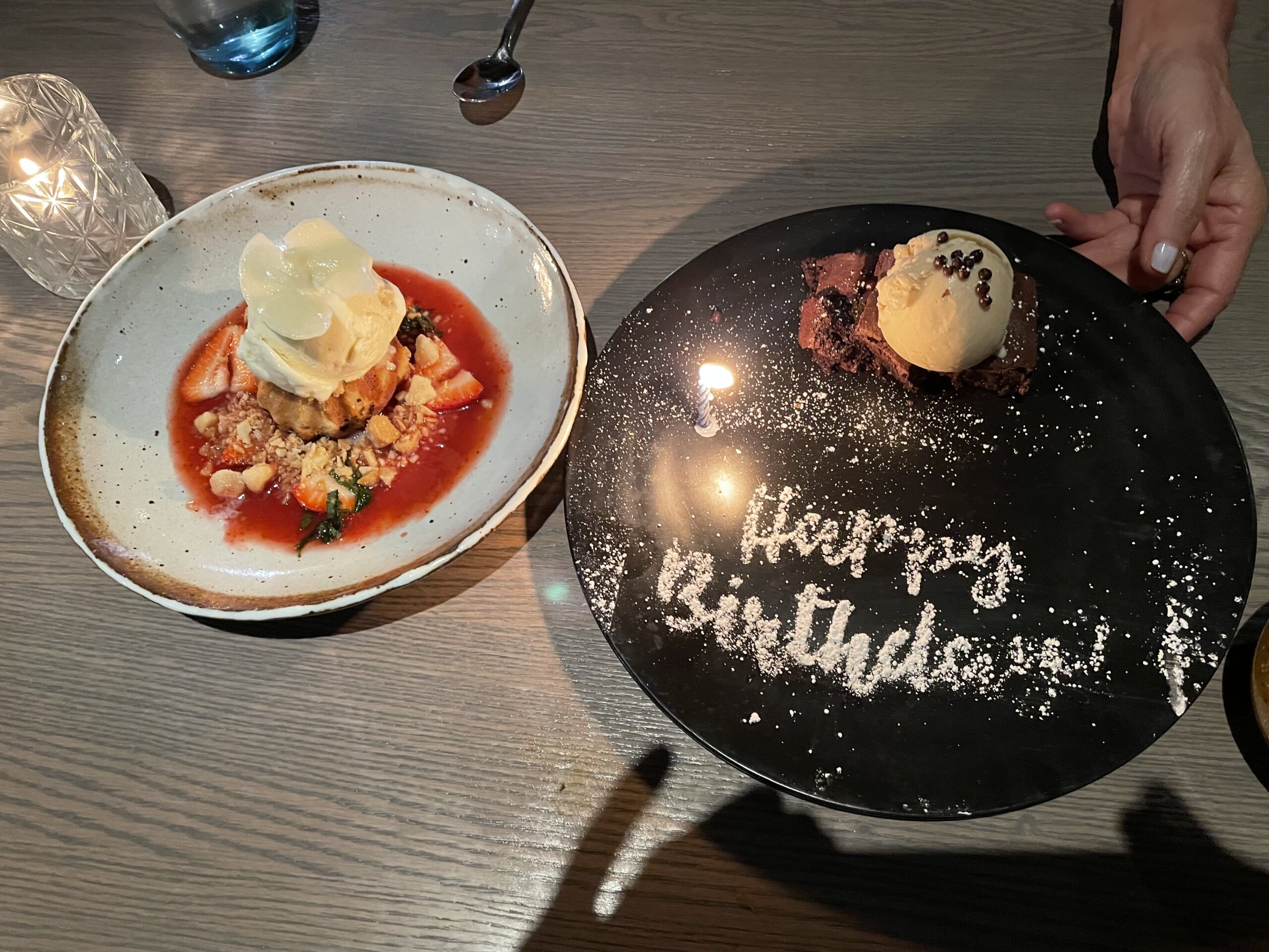 The finale: a delightful and very pretty vanilla bean madeleine with crème de Violette, lemon verbena and macerated strawberries…plus a chocolate confection the house threw in to acknowledge our celebration. A Happy Birthday indeed for my piscinophilic (yes, I just invented that word), pal Foodie Friend #3! We’ll be back!