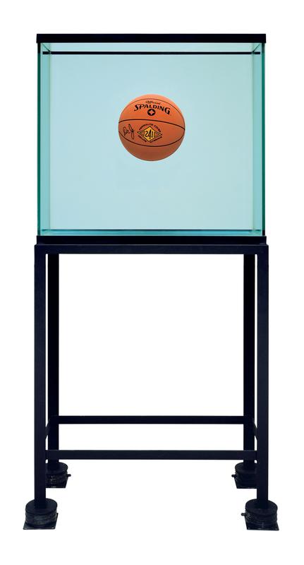 eff Koons, One Ball Total Equilibrium Tank (Spalding Dr. J 241 Series), 1985. Glass, steel, sodium chloride reagent, distilled water, basketball; 64 3/4 x 30 3/4 x 13 1/4 in. (164.5 x 78.1 x 33.7 cm). Collection of B. Z. and Michael Schwartz. ©Jeff Koons.