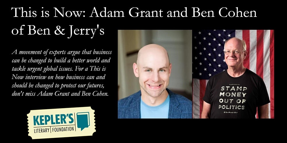 Grant specializes in organization psychology at the Wharton School of the University of Pennsylvania. His Ted talks and books— especially Give and Take— show that generosity and altruism benefit everyone: company, employees, clients. And Ben Cohen, together with co-founder Jerry Greenfield, birthed the landmark Ben & Jerry’s ice cream company. The endeavor thrived, even as its two creators openly endorsed political causes for the public good. Join these gentlemen for a This Is Now conversation with Kepler’s in-house journalist, Angie Coiro, as they ponder the vision of a robust economy and a better world existing together. Instead of a set ticket price, they ask that you consider a donation to support the production of this event. Keplers.org
