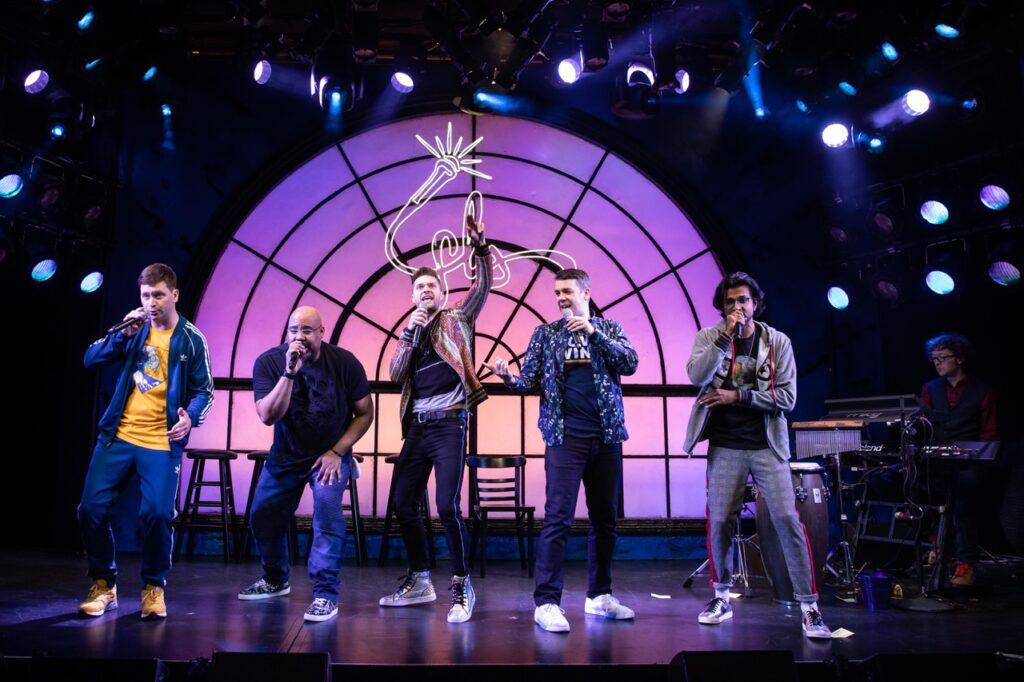 Chris Sullivan (left), James Monroe Iglehart, Andrew Bancroft, Anthony Veneziale and Utkarsh Ambudkar at a “Freestyle Love Supreme” performance at Greenwich House in New York City. When the show performs at Sydney Goldstein Theater as part of Sketchfest, audiences will find out who’s in the cast only as the show begins.