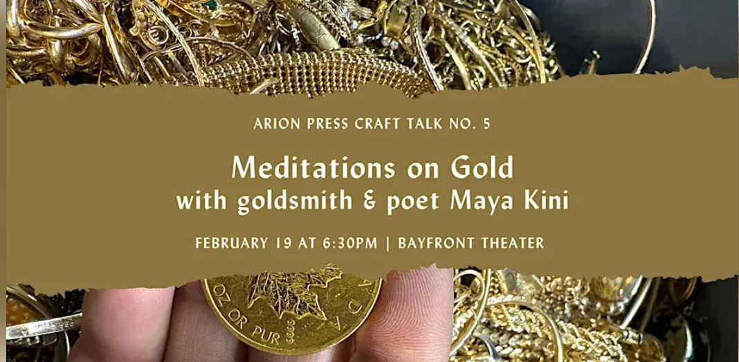 Fort Mason hosts unique, thoughtful and meaningful events. “Kini, “is no exception. On Thursday, February 19, 2026, from 6:30 p.m. to 8:30 p.m. in the Bayfront Theatre, Building B, Third Floor, you will be intrigued by this one hour talk and will most likely come home with a gorgeous creation. Maya Kini creates jewelry and sculpture and writes about the intersection of craft, language, and the body. The one- hour talk is followed by a reception in the Arion Press space in Building B, First Floor. MEDITATIONS ON GOLD