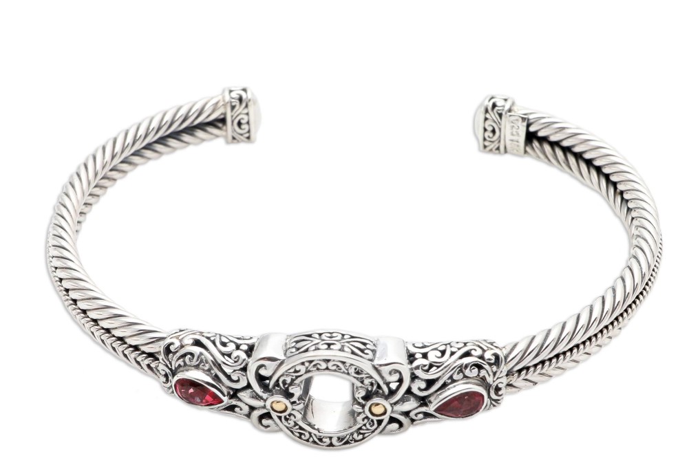 This captivating cuff bracelet from Bali’s talented artisan, Wayan Neri, beautifully showcases the centuries-old silversmithing artistry of the Island. Two pear-shaped garnets surround the open center revealing intricate swirling designs accented with delicate touches of 18k gold plating. The cuff band features a double rope pattern called tali air capped with matching motifs. With its ornate yet refined style, this bracelet is a stunning addition to any jewelry collection. Made in Indonesia. $149.99