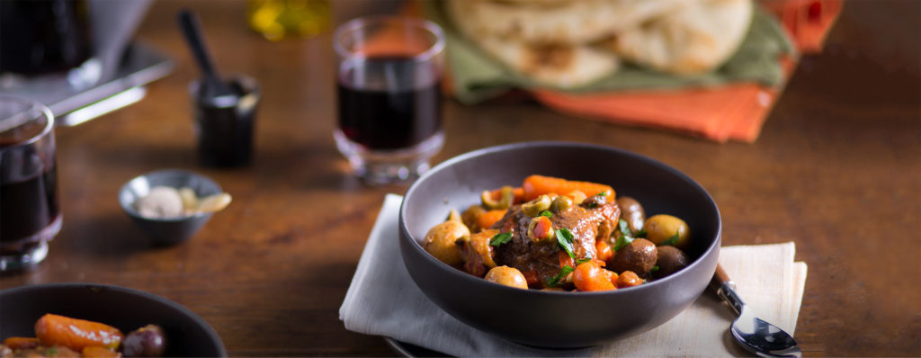 - STEP THREE Heat skillet over medium-high. Add chicken and cook until browned, about 3 minutes per side. Remove from pan and place on top of carrots and potatoes. Add the onion and garlic to the skillet and cook until the onion is softened, about 3 minutes. Add ginger and cook 1 minute, stirring constantly. Put in the slow cooker and top with dried apricots, raisins and olives.