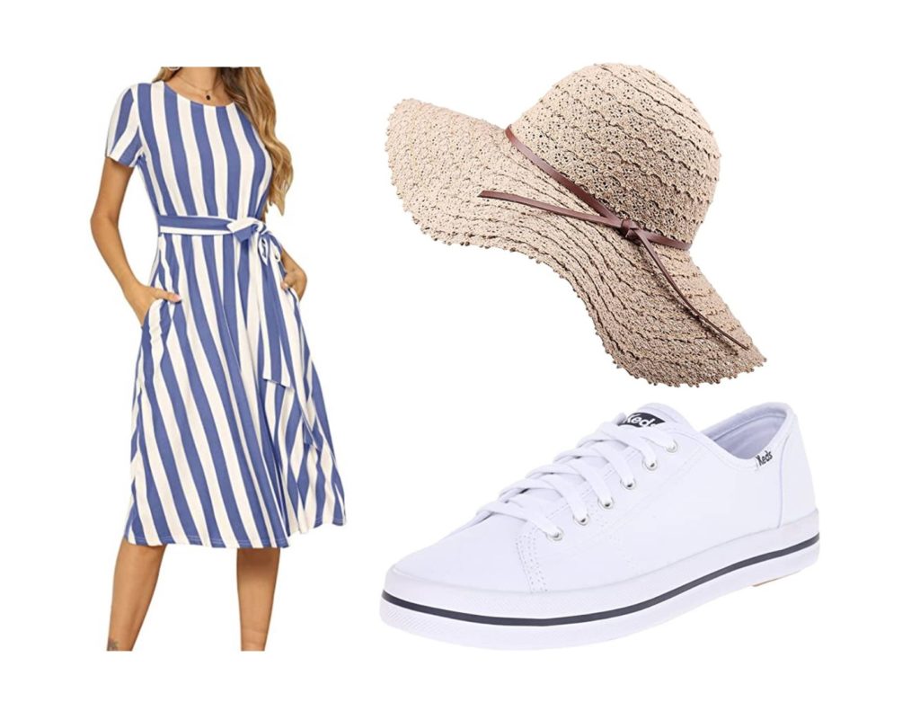 Keds Women’s Kickstart Fashion Sneaker. Available at Amazon. Pair them with this Short Sleeve Striped Casual Flowy Midi Belt Dress with Pockets. Available on Amazon. Add a summer floppy hat. Available on Amazon.