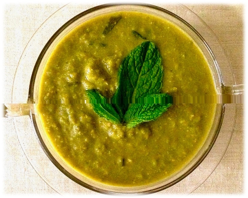 Remove and serve warm. Or place into a container in the refrigerator until chilled. Remove from refrigerator and serve in bowls. Garnish with fresh mint leaves.