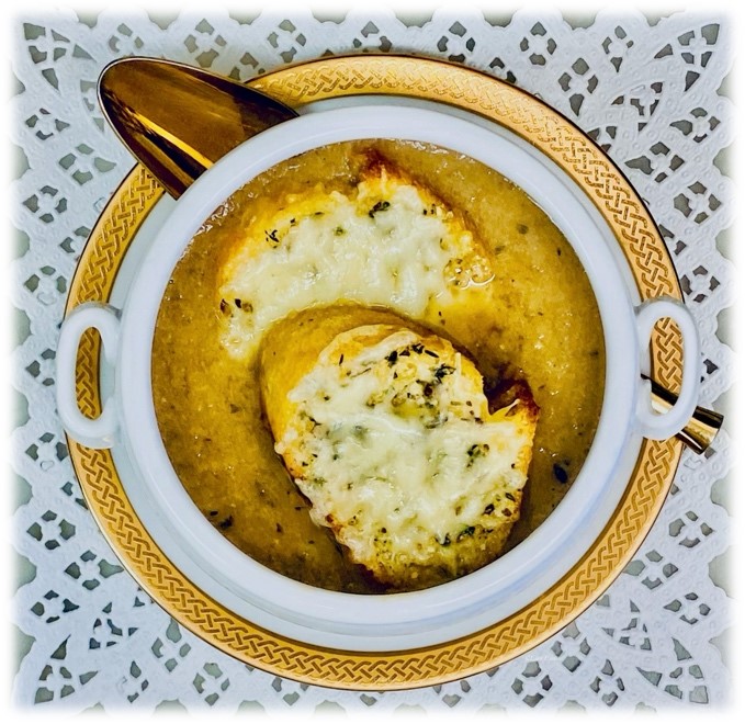 - Ladle the soup into bowls and top with toasted cheese baguette slices.