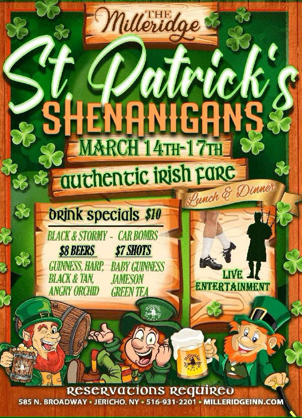 Are you ready for an unforgettable St. Patrick’s Day celebration? The Historic Milleridge Inn in Jericho is stepping up and bringing the Emerald Isle to Long Island. Enjoy traditional Irish food, festive drinks, and an atmosphere brimming with laughter and good times. Feel the rhythm of Ireland with performances from high-energy Step Dancers. Let the soul-stirring melodies of live bagpipe music add to your celebration. Join the shenanigans and make this one St. Patrick’s Day to remember.  www.milleridgeinn.com