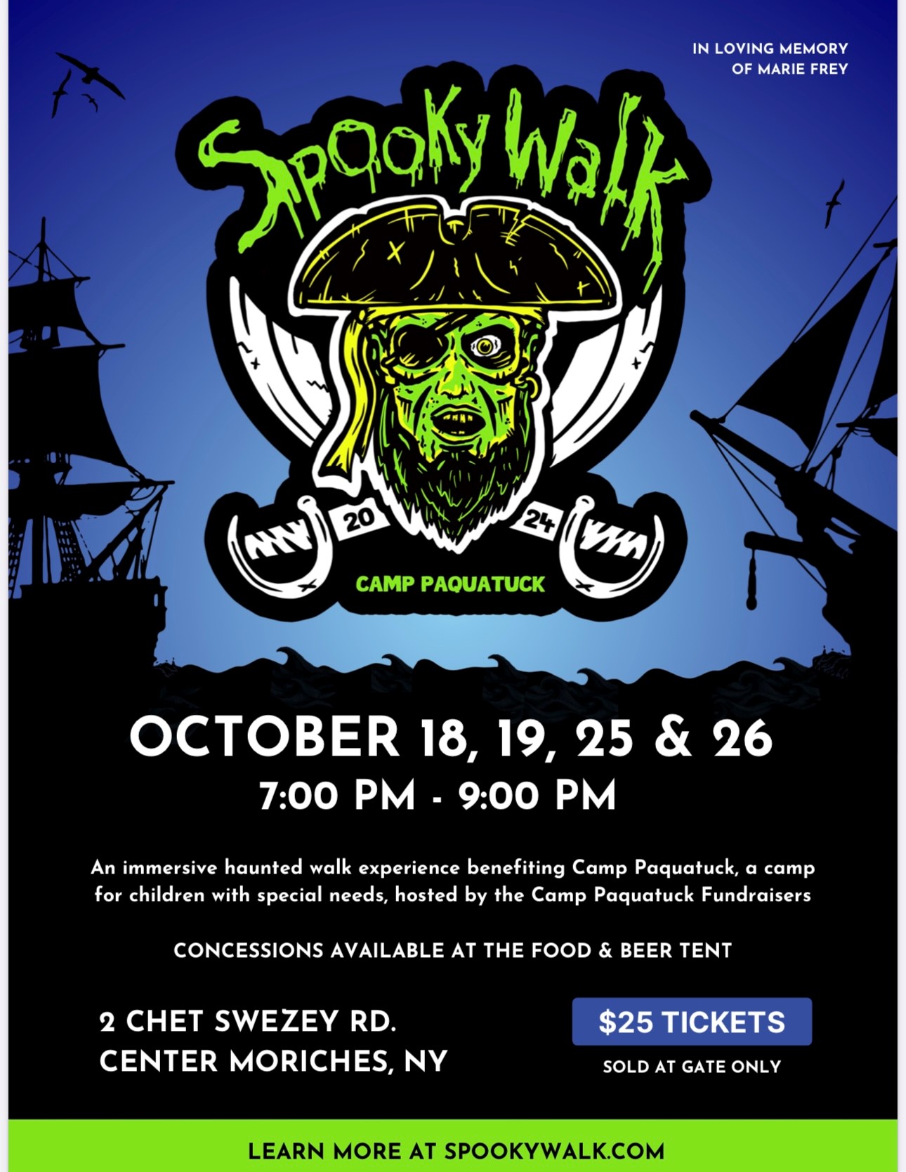 Now in its 36th year, the Spooky Walk is open the last two Fridays and Saturdays of October from 7 PM to 9 PM. The entire $25 admission fee benefits Camp Paquatuck, which is a camp for adults and children with disabilities. Delivering about 45 minutes of really scary scares, the Spooky Walk is known as the longest haunted walk trail. A free shuttle bus is available in the overflow parking area a half mile away. A food tent and a beer tent are available on site. Wear your running sneakers for this one! www.spookywalk.com