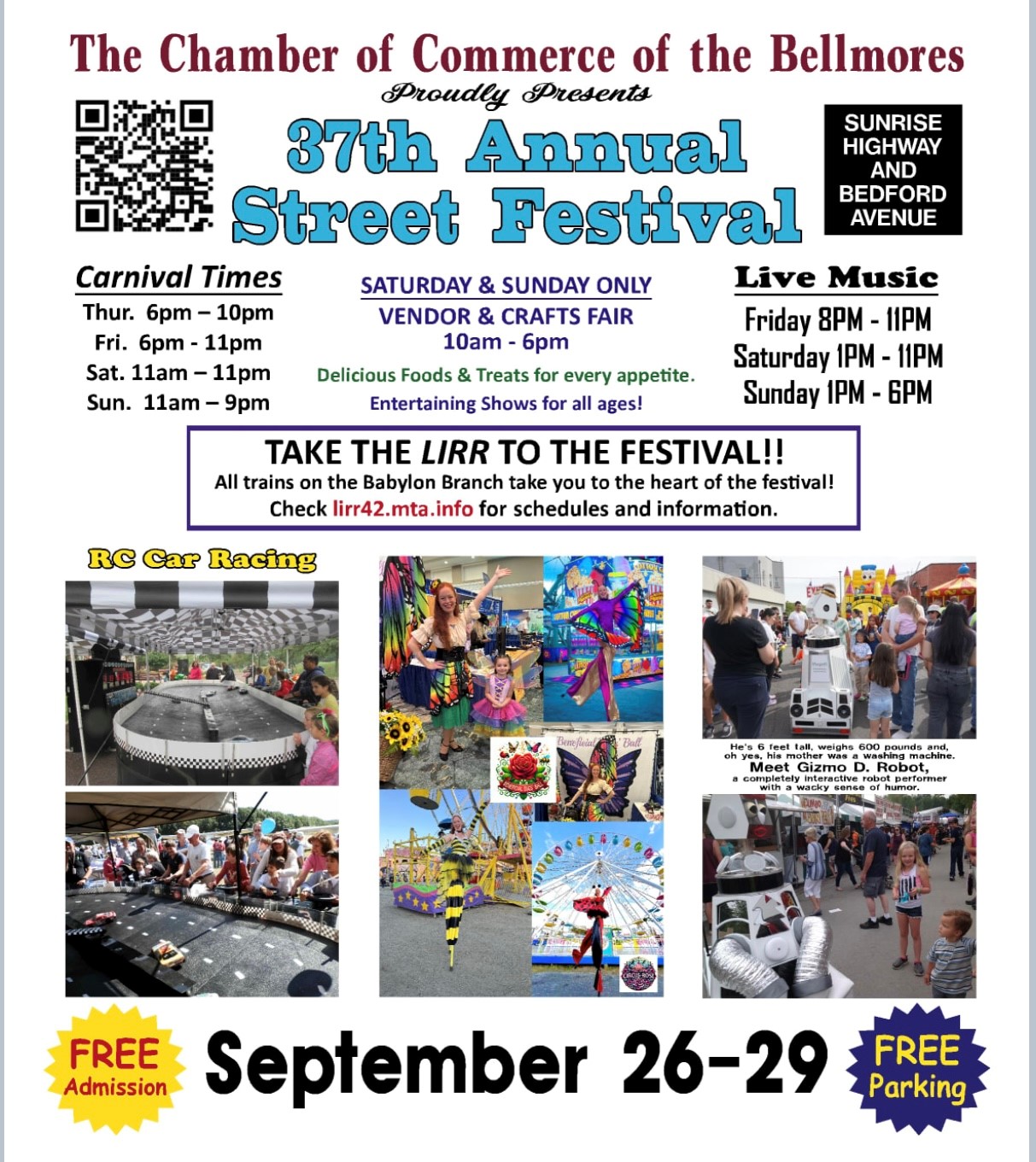 The Chamber of Commerce of the Bellmores presents its 37th Annual Bellmore Family Street Festival this weekend. 37 years of running a successful, well-attended festival speaks volumes for this Chamber of Commerce. Live music, a carnival area, vendors, crafts, foods, treats, and entertainment for all ages will certainly fill your day. Meet Gizmo D. Robot whose mom was a washing machine. Admission and parking are free. The LIRR Babylon Branch lets you off in the center of the fair if you prefer not to drive. www.bellmorechamber.com