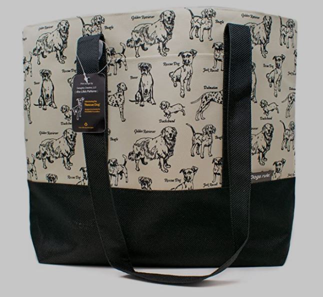 This limited-Edition Tote Bag features hand-drawn pattern. The tote is lightweight, durable canvas tote with inner lining to maximize strength (900D polyester) Top zipper and front pocket 18” wide x 14” tall. Dog breeds shown include: Golden Retriever, Boxer, Dachshund, Jack Russell, Beagle, Dalmatian and the Rescue Dog. These are sold by PEDIGREE Foundation, a 501(c)(3) private foundation that supports shelters and rescue organizations, as well as encouraging people to ADOPT, VOLUNTEER, and DONATE. Tote is $35.00 at Amazon.