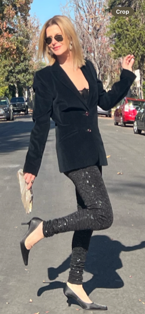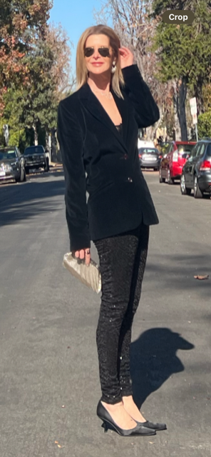 There’s something about an all-black look. My holiday version combines lux fabrications and reflective textures for a simple and truly elevated look. I’ve always had a love-hate relationship with sequins and metallic leggings because they can look a bit tacky when poorly styled. Often times they’re used as the focus piece but in my opinion, they should be styled exactly the opposite way. I personally like to wear them within a look that’s collective and without a focal point or focus item. This is best achieved when our fabrics are balanced, and our color choices are solid. The total look should be easy for the eye to take in which is why black is a great way to go. My sequin leggings, Amazon, are very reflective so I’m using my very flat matte velvet jacket, J Crew, to tamp them down. Neither piece takes away from the other rather they become equalized and meet in the middle. This is going to sound strange but I’ve also considered my actual skin as part of my look.