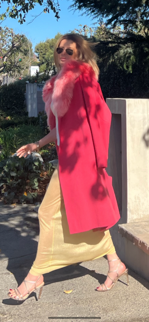 The v-neck on this sweater is rather narrow and not very deep so I want to follow the line using one simple piece – a pearl and diamond pendant necklace. It’s clean, uncluttered, and pairs with my diamond hoop earrings. I brought in another silver-toned element that works with my jewelry – a vintage, Whiting and Davis, chain mail bag and its perfect little rhinestone closure. A pair of gold strappy sandals, Sam Edelman, bring in a modern element to balance with the retro feel of my look. They also open up some space against the full coverage of the long skirt. And my showstopper…..a vintage raspberry cashmere swing coat with a dye-to-match fox collar. It’s a beautiful, unexpected pop of joyful color that will no doubt turn heads upon arrival and departure.