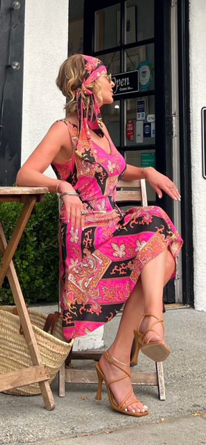 I’m thrilled with how it all turned out. I styled it very simply because of the bold colors and the all-over print. Rather than going with a black sandal, the easiest and most obvious choice, I pulled the most obscure orangey neutral tone in the print as my color choice for a strappy high sandal, Schutz. The neutral tone elongates my legs and conveys a casual “Je ne sais qua” that I really love. I went with a big straw bag, Bohemia Marrakech, for its easy carefree vibe. I used a few small pieces of jewelry that wouldn’t compete with the dress like these thin rose gold hoops play into the gipsy feel from the side tied scarf, a small vintage gold link watch, Omega, bangles, Cartier, and a simple single pendant necklace.