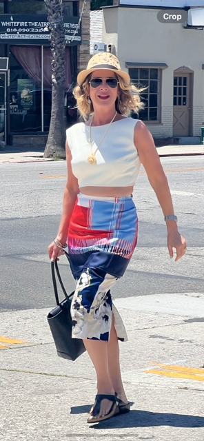Here’s my version – I’ve taken my print high waist pencil skirt, Samantha Sung, and layered a contrasting print scarf, Christian Dior, 3/4 of the way over. Rather than a side tie opening, which would make my curvy body look much too hippy, I pinned it in the back with a brooch. The skirt takes up a lot of my body so I went with a solid cropped sleeveless vintage blouse, McInery. The playful quirkiness of this look was what I wanted to emphasize so I brought in my anchor print fedora, Gisele Tune, chunky sandals, Birkenstock, and a big black handbag, Carla Mancini. My stylistic representation of Dries’ creative work looks and feels like me. I drew inspiration from his design and made it my own.