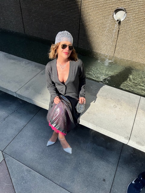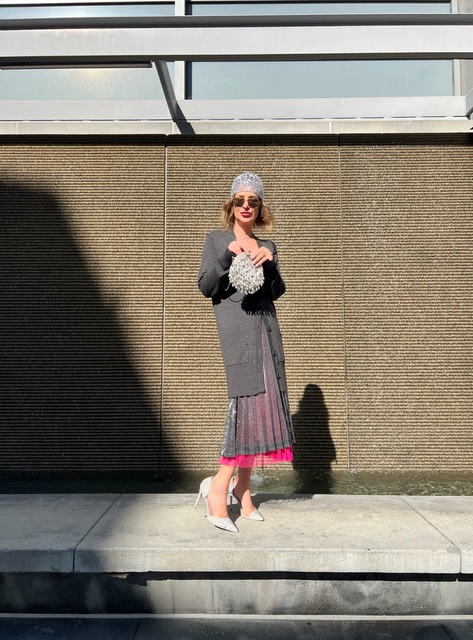 Holiday is a great time for our accessories to do most of the heavy lifting. I’m using mine to add a dash of 1920s flapper to this easy Holiday look that I pulled together right out of my closet. Fashionably speaking, garments with metallics sequins and high shine have been trending for the last few years so much so that they’ve become a wardrobe staple in our day to day. On the one hand it’s great because we already have and know how to wear them but on the other hand how do we make our sparkle special again? Today, I’m wearing a grey Grandpa cardigan, Barneys NY, over a sheer grey pleated sequin skirt, J Crew, with a neon fuchsia tulle skirt, Shein, under it. The longer length of the Grandpa sweater creates that elongated body style reminiscent of those in the 1920s.
