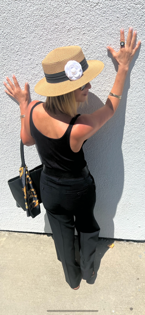 I’m able to wear flat sandals, Sam Edelman, with my high waist pants because they’re the right fit and cut for my short 5’3” body. I had to, of course have them tailored like any good quality pant. In my case they had to drop the crotch which helped lower the waist so they’d sit right at my bottom ribs. The flat front body is more fitted and gradually starts to widen for a flowy wide leg. I’m using a wide black belt, Barneys NY, to emphasize my waist and create proportion which is especially important when going monochromatic. The large brass belt buckle plays off of the straw hat, Lanzom Hats, colour-wise that I’ve accessorized with a white flower pin. I’m amping up the Chanel vibe of the pin, Chanel, with a chain print scarf, Chanel, tied to my bag, Carla Mancini, and a vintage black & white button ring, Adornuo Designs. I love that with only a few little white placement pieces my all black look really POPS.