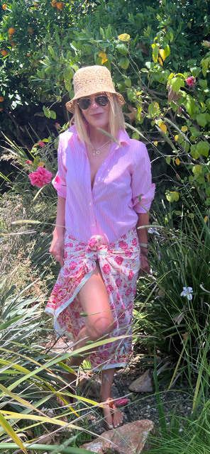 I rarely gravitate toward pink garments. As pretty as so many of its shades… it’s just not me. If I’m going to wear it, I need to style it in a way that really makes it my own. I live in sarongs especially in the Summer. There’s nothing easier or more comfortable than a beautiful weightless piece of printed fabric that can be wrapped around the body like the sarong, Amazon, I’m wearing today. The more “me” part comes with the unexpected pairing of a pinstripe blouse, Ralph Lauren.