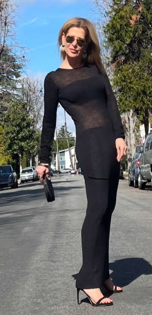 Felicia Arlin shows us that many styles, like Tomatoes, get better with age. Here she is in two Donna Karen long knitted dresses that she bought in the ‘90s that have held up remarkably well and look as stylish today as they were then.