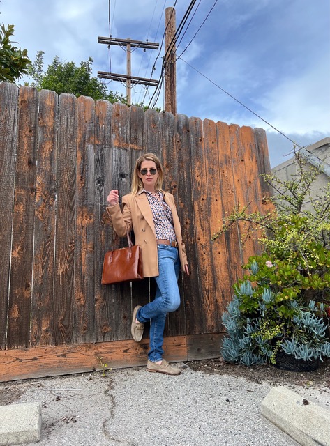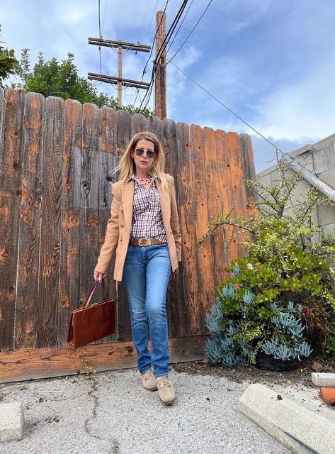 Back in my Garment Industry days, I wore jeans and a t-shirt almost every day to work it was my thing a self imposed uniform. These days I don’t wear them as much but when I do they seem to be part of a look that’s more styled and elevated like today. I’m wearing my low-rise jeans, AG (the stilt), and a vintage, Gucci, belt with a check shirt from the (boy’s dept.), Tronjori on Amazon and a blazer, Zara.