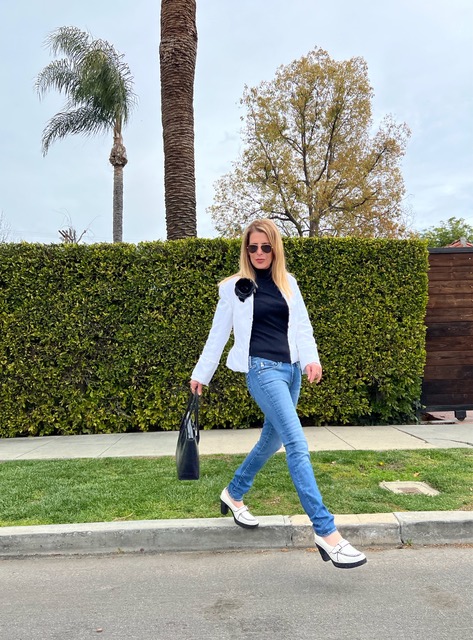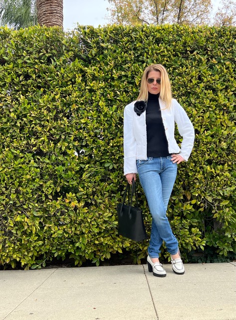 One of the things I love most about styling with denim is it “goes with the flow”. Today I’m wearing another “casual” look in the same jeans, AG (the stilt), from yesterday with a white linen blazer, Claude Barthelemy, a black rib turtlenck, Zara, my black/white gum bottom mid-heel loafers, Matte Voglia and black bucket bag, Carla Mancini. Notice how completely different my denim looks are between both stories. It’s because I’m using an achromatic colour scheme of black and white that draws the eye’s focus. When we use black and white next to each other they pop! And everything else somewhat disappears.