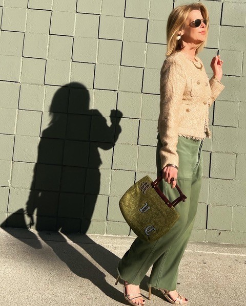 Whether everyday or casual holiday dressing this is an easy way to elevate a look using only one color paired with a metallic. My vintage fatigues get a boost with a gold boucle crop blazer, Gisele, and I’m wearing it as a top. The metallic fabric, gold buttons, and light sprinkling of sequins are perfectly balanced rather than blinding or over-the-top. The frayed edge tones down this very classic structured silhouette allowing for more casual options. Both of my garments have a lot of body coverage and to create balance, I went with an open strappy high gold sandal, Sam Edelman. They look festive and elegant, and their reflective quality bounces the light upward where it belongs.