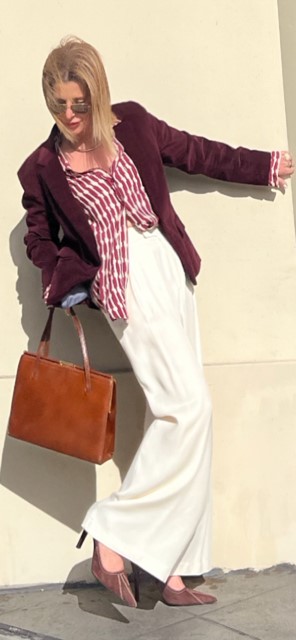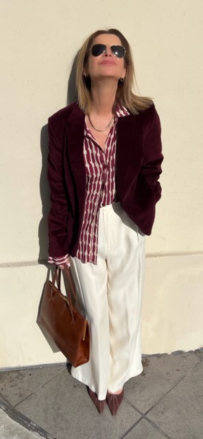 …at least for the season. It’s one of those perfect colors that looks great on everyone. With a strong base note of red and green that alone many have a hard time wearing, it’s the dash of blue that makes it burgundy and a total game-changing color. I built my look around a deep burgundy velvet jacket with brown suede elbow patches, J Crew. I put my look together using classic pieces with a lot of movement to offset the heavier velvet jacket. My all over burgundy/off-white print blouse, Mango, complements the jacket beautifully. The lighter shade of burgundy against the darker jacket allows both shades to stand out and complement the other. These flowy off-white pleated trousers, Zara, are sophisticated and chic. The bright color contrast is bold and dramatic. I did a one-sided front tuck to the blouse to create a waist and left the rest hanging loose so it moves and flows like the pants.
