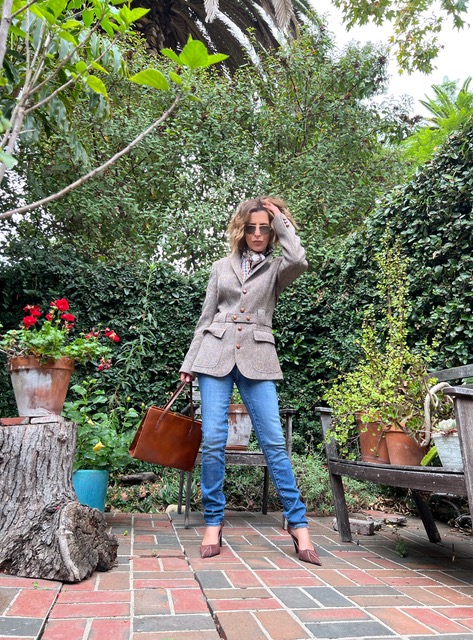 This very British classic and slightly eccentric tweed jacket, JG Hook, was my mother’s and she looked great when she wore it. I’m not really a tweed kinda girl but I figured at some point I’d get to it. Needless to say, it’s been hanging in a garment bag for years. I finally took it out and spent some time really looking at the fabric. I noticed a subtle mix of multicolored flecks within the tight weave of the brown and white pattern. The old tweed jacket became new and interesting, and this is how I styled it. I was inspired by the colours within the tweed, so I thought I’d do a pattern mix with my shirt.