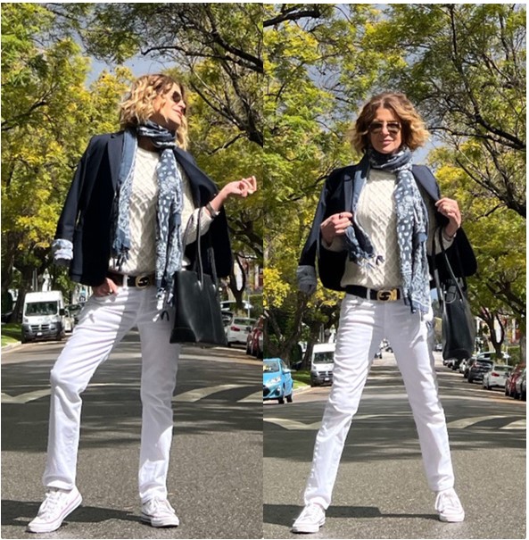 Do you wear white and off-white together? For some reason I feel like the off-white sweaters Zara, makes it, ok, to wear white jeans, Rag and Bone, pre Memorial Day. I grew up with a Mother from NY and a Father from Canada so white jeans before Memorial Day was a real thing in my house. The two colours together feel very east coast. I went with a shorter length black Academy jacket, Gap, that aligns with the bottom of my sweater and the top of my jeans to make my body look more in proportion. For the same reasons, I chose a bag with handles, Carla Mancini, rather than a crossbody strap to keep everything balanced. My long black/white bandana print scarf, Amazon, ties everything together and with my chucks, Converse, it’s pure Americana.