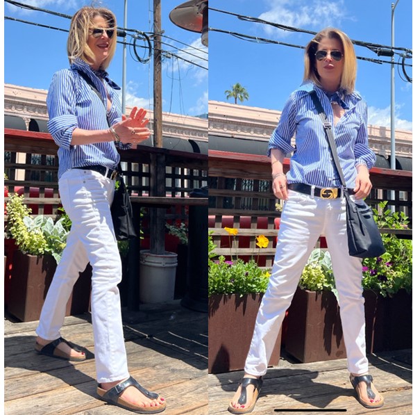 My blue and white stripe shirt, Chaps, and skinny white jeans, Rag and Bone, are styled with pops of black from my accessories. My black sandals, Birkenstock, black belt, vintage Gucci, and crossbody bag, Longchamp, appear somewhat heavier in weight so I’ve placed them around the heaviest garment, my jeans for a nice balance and distribution of weight. I’ve twisted and tied a blue/white bandana scarf, Amazon, around my neck with a combo of chunky and freshwater pearls and a gold link chain, Gorjana, that ties my little hoop earrings and belt buckle together. This easy casual look feels super tight and elevated because I took a few seconds to style it. Zhuzhing my shirt sleeves doing a front tuck and layering my accessories build dimension to make even the most casual look a lot more interesting and complete