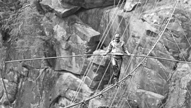 As you stand and inhale the mountain air, hear the sounds of the gorge, and admire the spaces around you, notice the towers that are incongruous to the surroundings. Towers purpose: These are the towers that anchored the wire when Karl Wallenda (in photo) walked across on the suspended wire in 1970! Just seeing the towers and standing on the edge is enough to cause goose bumps as you picture the hair raising feat. Nik Wallenda, the great grandson hopes to duplicate his great grandfather’s feat in 2015. Sidebar: Nik’s feat of crossing the Colorado River was televised by the Discovery Channel in 2013. If you did not watch it, take lots of deep breaths, sit down and watch the rerun.