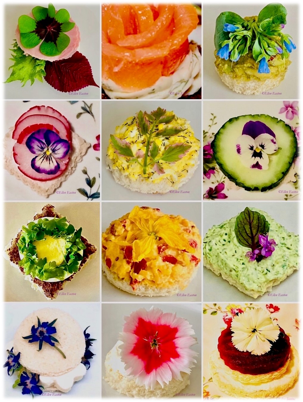 Linzer Style Tea Sandwiches ~ Recommended Tools and Garnishes: Small and mini cookie cutters, scissors, vegetable scraper, wax paper, carrots, cooked beets, chive, leek, pimentos, colored bell peppers, olive, and edible flowers.