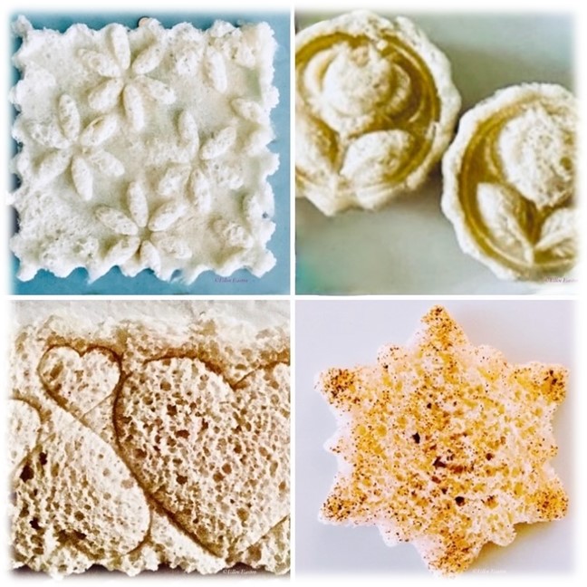 Using a cookie cutter in the shape of your choice, cut out two (2) identical bread pieces. Apply softened butter, either plain or seasoned, sparingly on one side of the bread to keep the bread moist. Using a smaller size cookie cutter in the shape of your choice, cut out the center of the second piece of bread to create an open window. A helpful hint when using a very small cookie cutter – instead of trying to remove the bread from the outside of the cutter, gently ease the interior section out with the tip of a pointed knife.