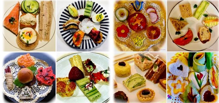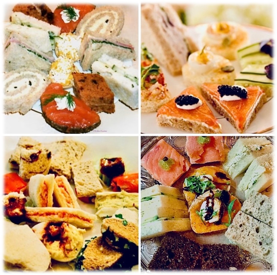 When planning your tea menu take into consideration how many of your savory items will be open-faced and how many will be closed. The origin of an afternoon tea sandwich was a closed finger shape. In modern times different shapes are not only acceptable they are encouraged. Cookie Cutters, embossed breads are fun ways to enhance the presentation. Puff pastry, Philo and tart shells, endive leaf, celery stalks, cucumber cups and mushroom caps are all good alternates for open face savories.