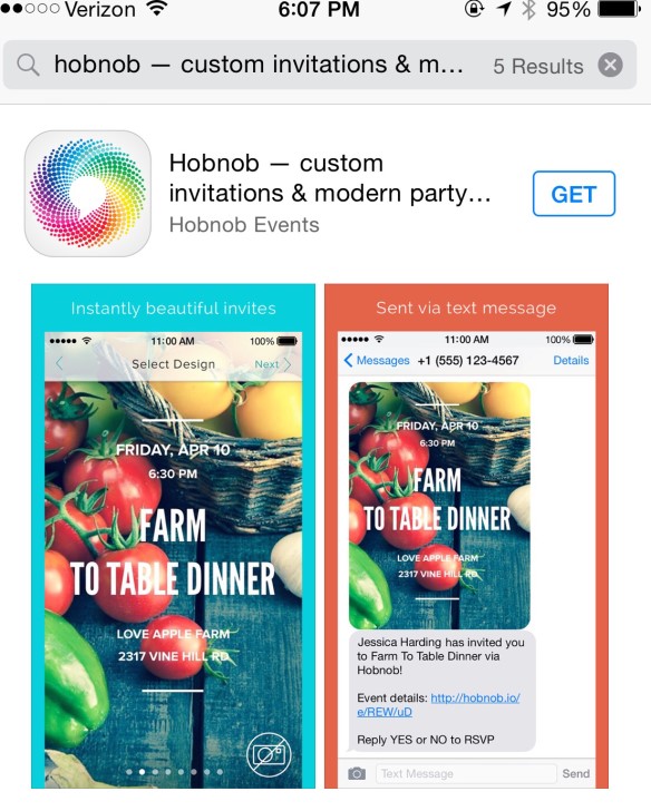 Enter a new app called Hobnob. The app is capable of sending entire invites over text messaging. That means invitations are immediately received. I can’t wait to try this.