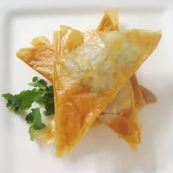 Working with 3 phyllo sheets at a time, brush each of them lightly with melted butter. Put them one on top of another. Cut them (short way) into 6 ‘columns’. At the bottom of each column, put on ½ tsp pesto and 1 tsp goat cheese. Form triangles, brush the tops with butter. Repeat until phyllo is finished (link HERE for a demo of how to make the triangles). Place on cookie sheets that are brushed with a little melted butter, and bake in 375 degree oven for 12 minutes (until they’re flaky and golden brown). Turn baking pans after 6 min. Triangles can be served either warm or at room temperature.