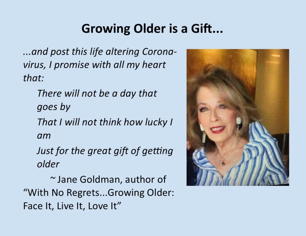 If the Coronavirus teaches us anything, and hopefully it teaches each of us many things, the overriding lesson is that if we are getting older, it is to be not faced as if a problem. Rather it is to be fully embraced and welcomed with joy, enthusiasm and much gratitude irrespective of what struggles or losses come with it. Clearly post the Virus, any of those struggles pale in comparison to all those who now would just love to struggle with the great gift of just getting older.