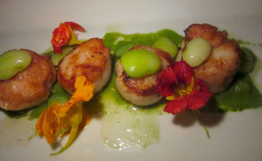 The Heyward’s shrimp and grits and scallop dish, photos may not be used without permission from Gael Greene. Copyright 2015. All rights reserved.