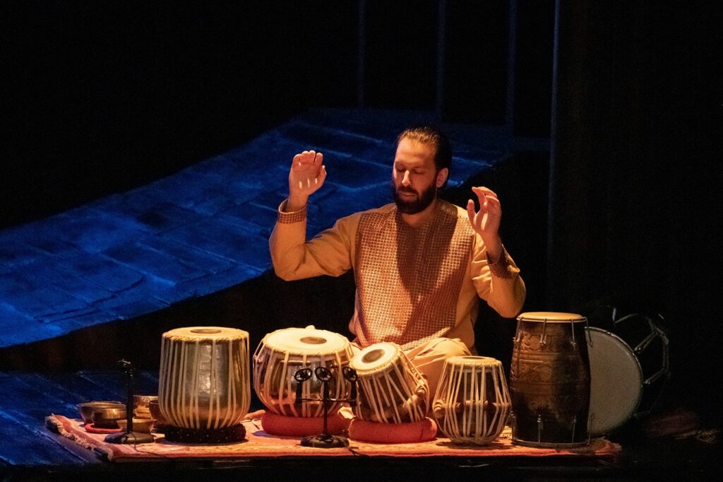 Salar Nader, a tabla artist, sits at the edge of the stage throughout most of the play, providing the exotic sounds and rhythm of the percussion instruments.